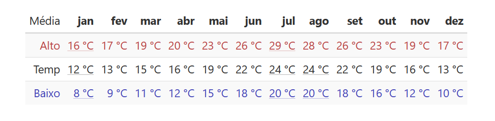 - Meses mais frios são Dezembro, Janeiro e Fevereiro, com menos tempo de sol diário e friozinho que é bem tranqüilo.